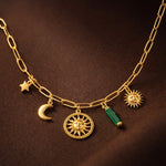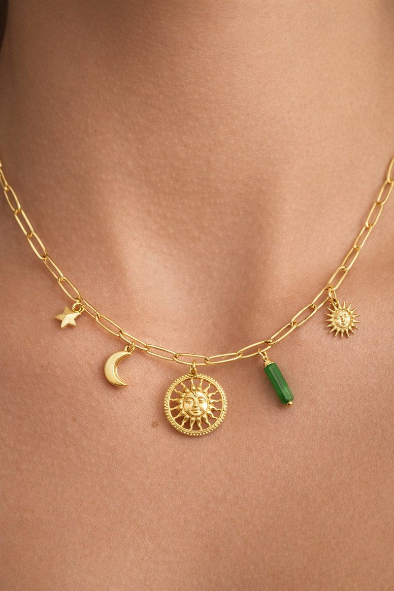 De bedels geven een unieke, symbolische look: denk aan een ster, maan, zon(motief) en een elegante steen-bedel in groen tint—een charm ketting die zowel boho als classy aanvoelt.