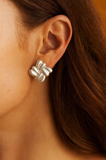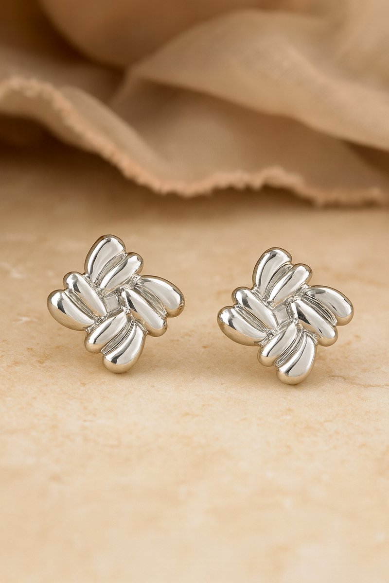 Maak elke outfit moeiteloos chic met deze zilverkleurige statement oorknopjes uit de Eira Serie. Vervaardigd uit premium stainless steel met hoogglans finish. Het elegante, bloem-achtige sculptuur van 2,45 × 3,45 cm is feestelijk en classy—perfect voor dagelijks dragen, diners, bruiloften en de feestdagen.