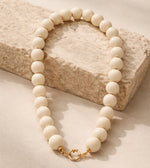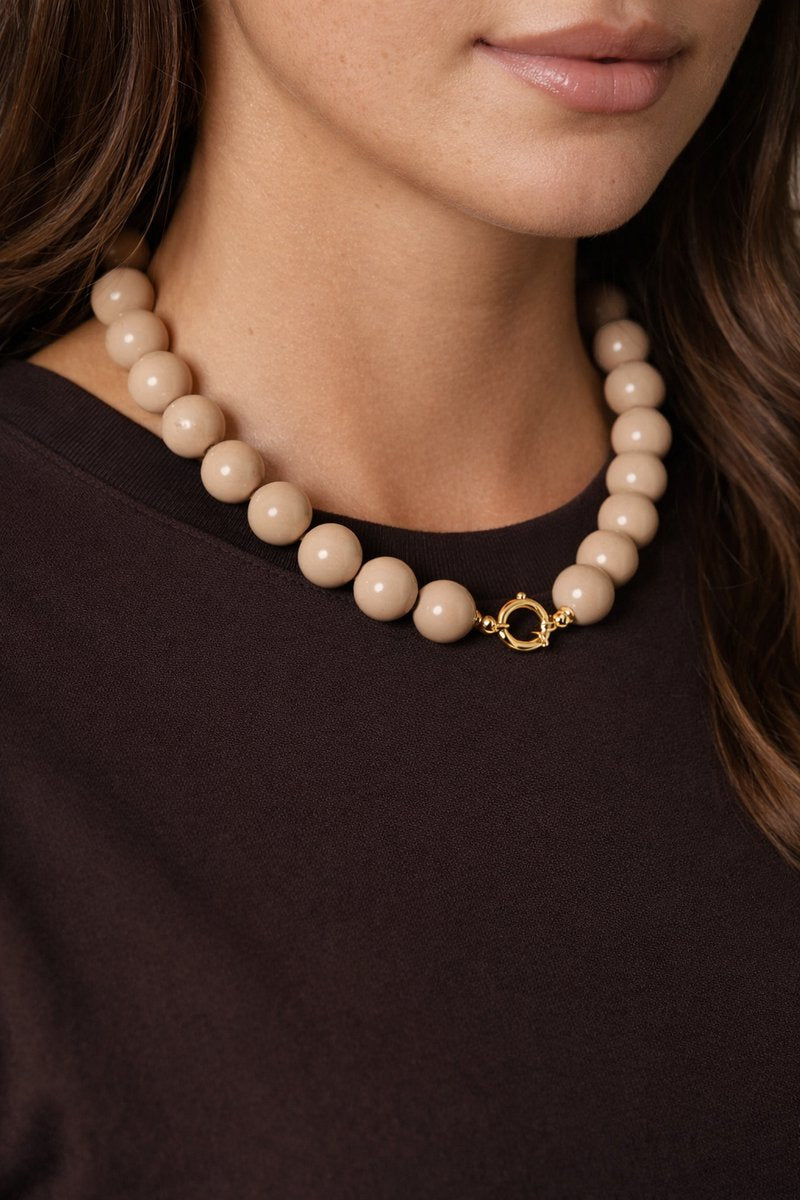 De Helsinki kralen ketting van Lundholm is nu ook verkrijgbaar in een verfijnde beige tint. Deze zachte, neutrale kleur geeft de ketting een rustige en elegante uitstraling die perfect past bij een minimalistische, Scandinavische stijl. De grote hars kralen van 15 mm zorgen voor een luxe statement, terwijl de beige kleur moeiteloos combineert met elke outfit.